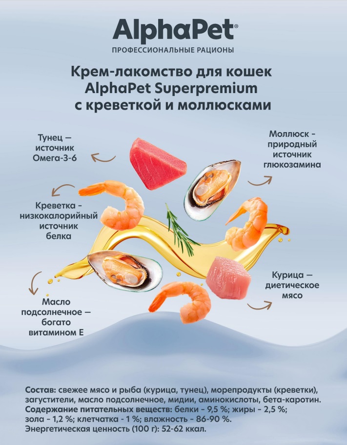 AlphaPet Superpremium (АльфаПет) 0,048кг крем-лакомство креветка моллюски для кошек (654820)