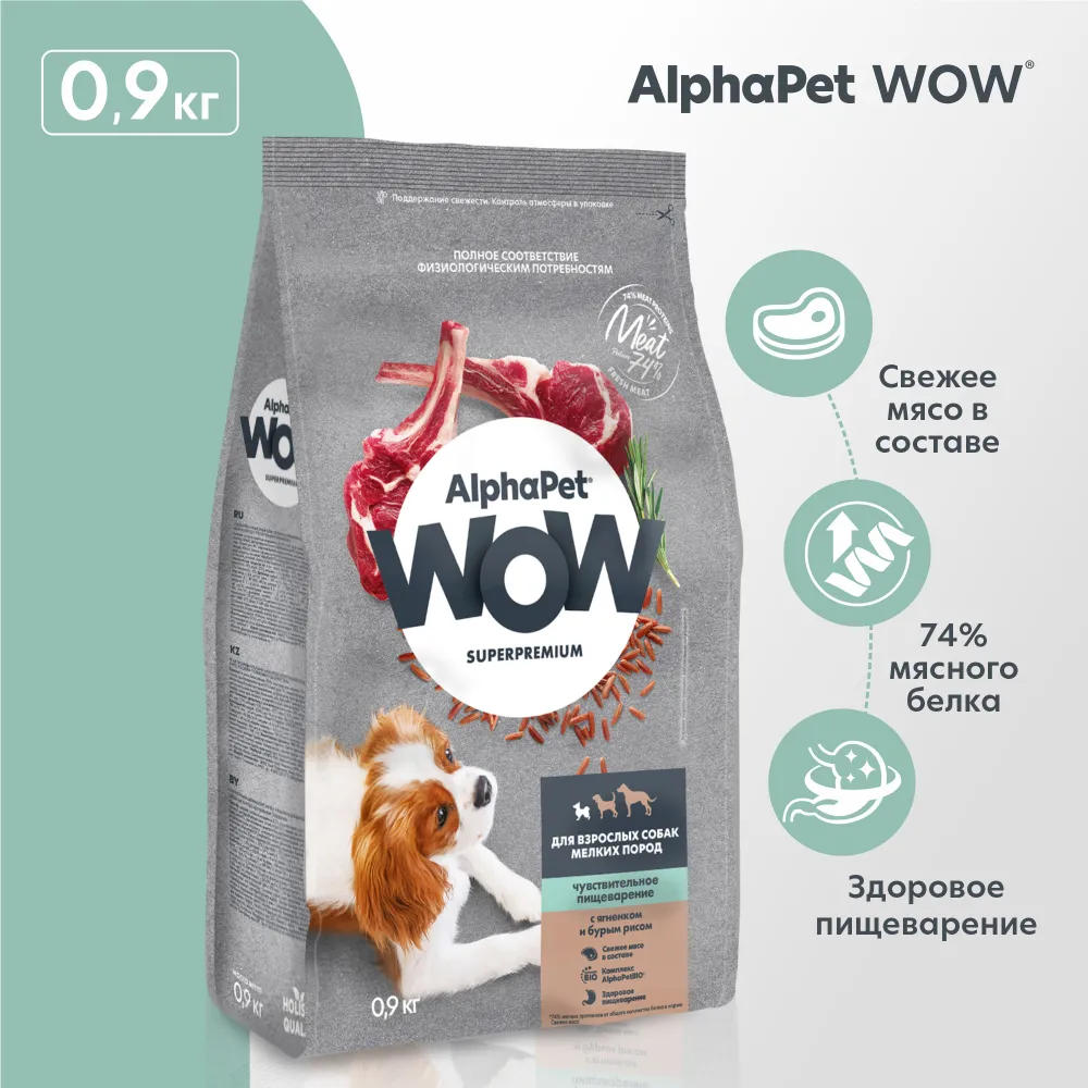 AlphaPet WOW (АльфаПет) 0,9кг с ягненком и бурым рисом сухой для собак мелких пород с чувствительным пищеварением (651553)