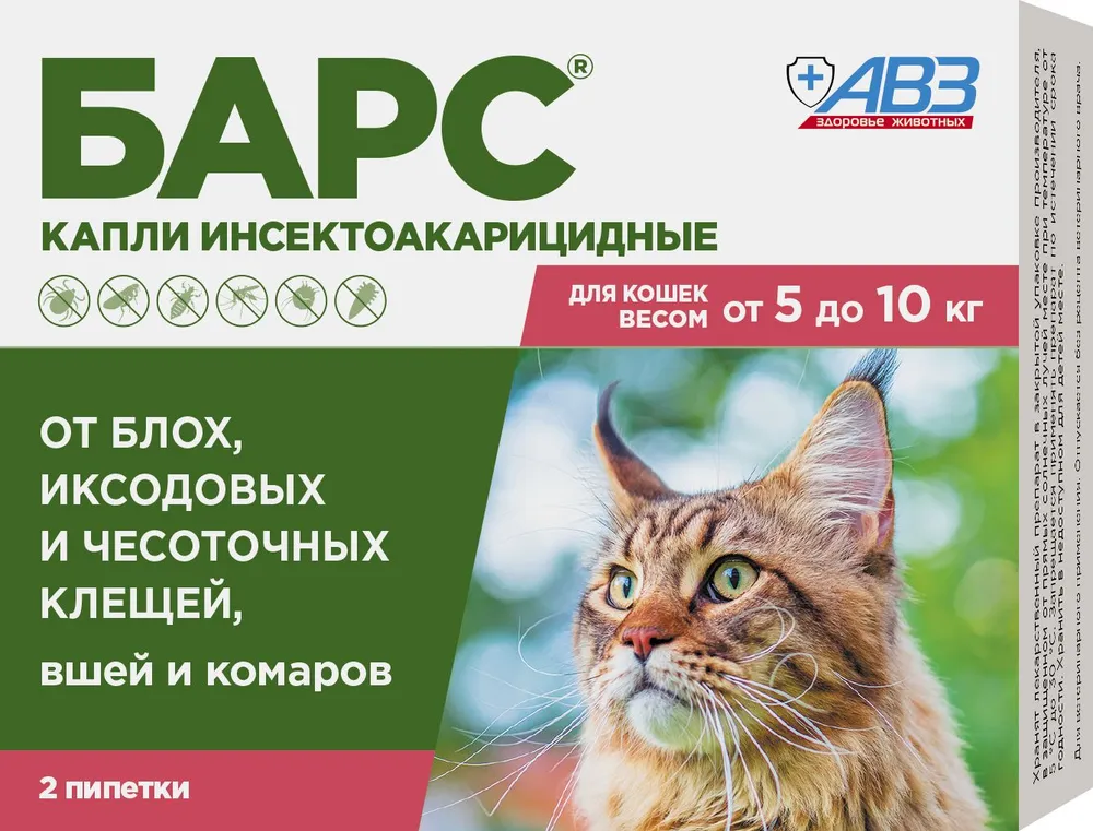 Барс капли (2пип) для кошек от 5кг до 10кг NEW от блох, клещей, хейлетиелл, вшей, власоедов (ЛИЦЕНЗИЯ)