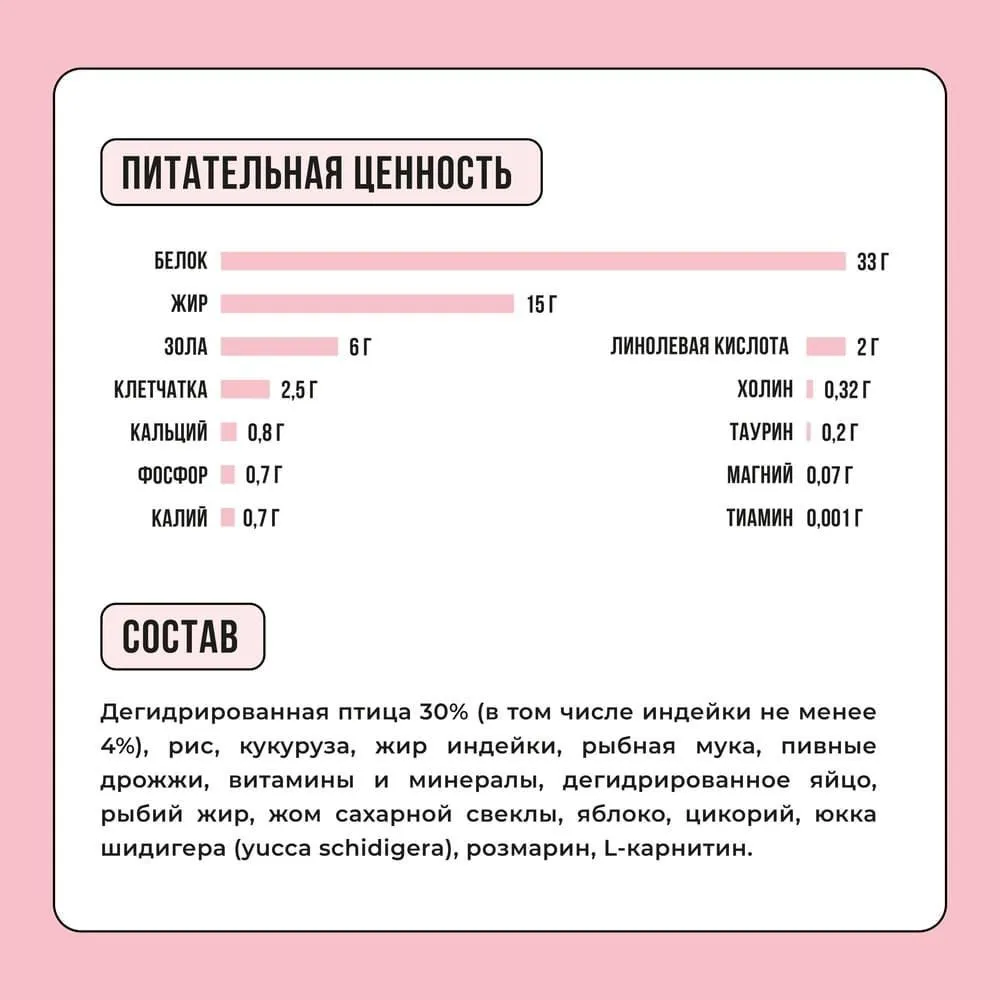 Питательная ценность на 100 г: белок: 33 г, жир: 15 г, клетчатка: 2,5 г, зола: 6 г, влага: не более 10г, кальций: 0,8 г, фосфор: 0,7 г, калий: 0,55 г, магний: 0,07 г, железо: 11 мг, селен: 40 мкг, медь: 1,1 мг, цинк: 9 мг, марганец: 1,5 мг, йод: 0,1 мг, витамин А: 1200 МЕ, витамин D: 55 МЕ, витамин Е: 30 мг, тиамин (витамин В1): 1 мг, рибофлавин (витамин В2): 1 мг, пантотеновая к-та (витамин В5): 1,5 мг, пиридоксин (витамин В6): 0,8 мг, фолиевая к-та (витамин В9): 40 мкг, цианокобаламин (витамин В12): 4 мкг, холин: 320 мг, витамин С: 40 мг, линолевая кислота: 2 г, EPA + DHA: 0,09 г, таурин: 200 мг, L-карнитин: 50 мг.