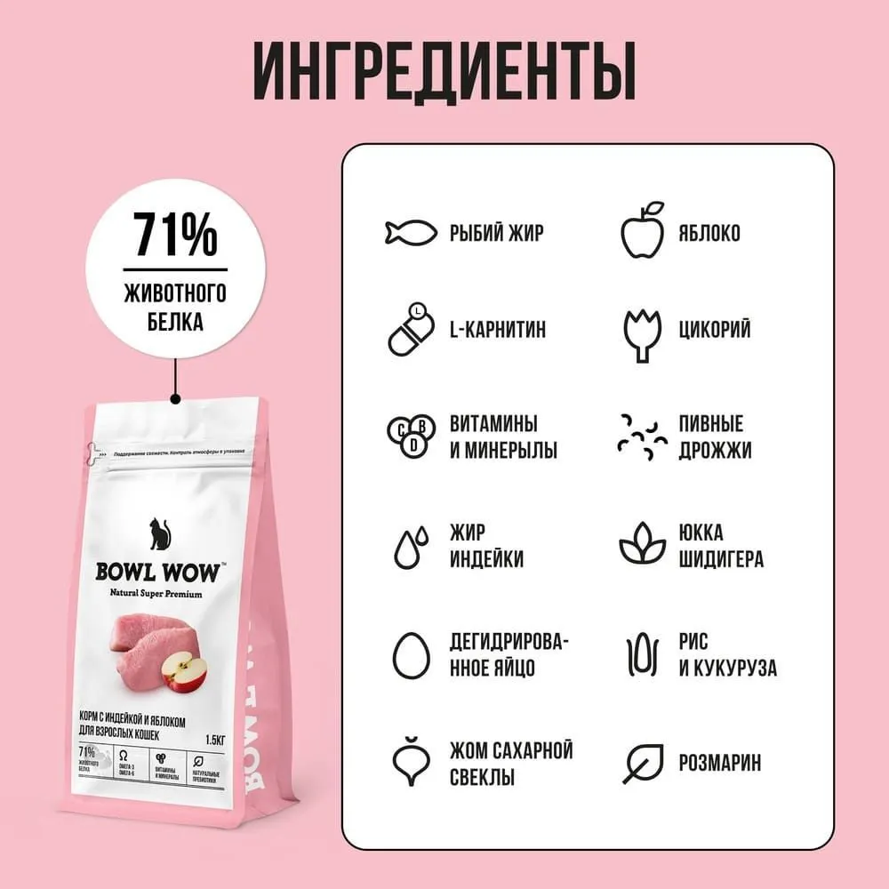 Bowl Wow 1,5кг с индейкой и яблоком сухой для кошек (660088)