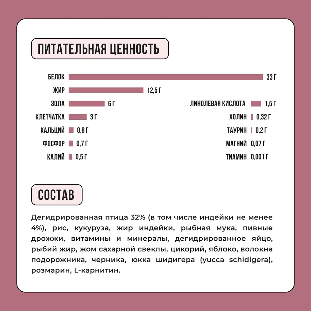 Дегидрированная птица 32 % (в том числе индейки не менее 4 %), рис, кукуруза, жир индейки, рыбная мука, пивные дрожжи, витамины и минералы, дегидрированное яйцо, рыбий жир, жом сахарной свеклы, цикорий, яблоко, волокна подорожника, черника, юкка шидигера (yucca schidigera), розмарин, L-карнитин.