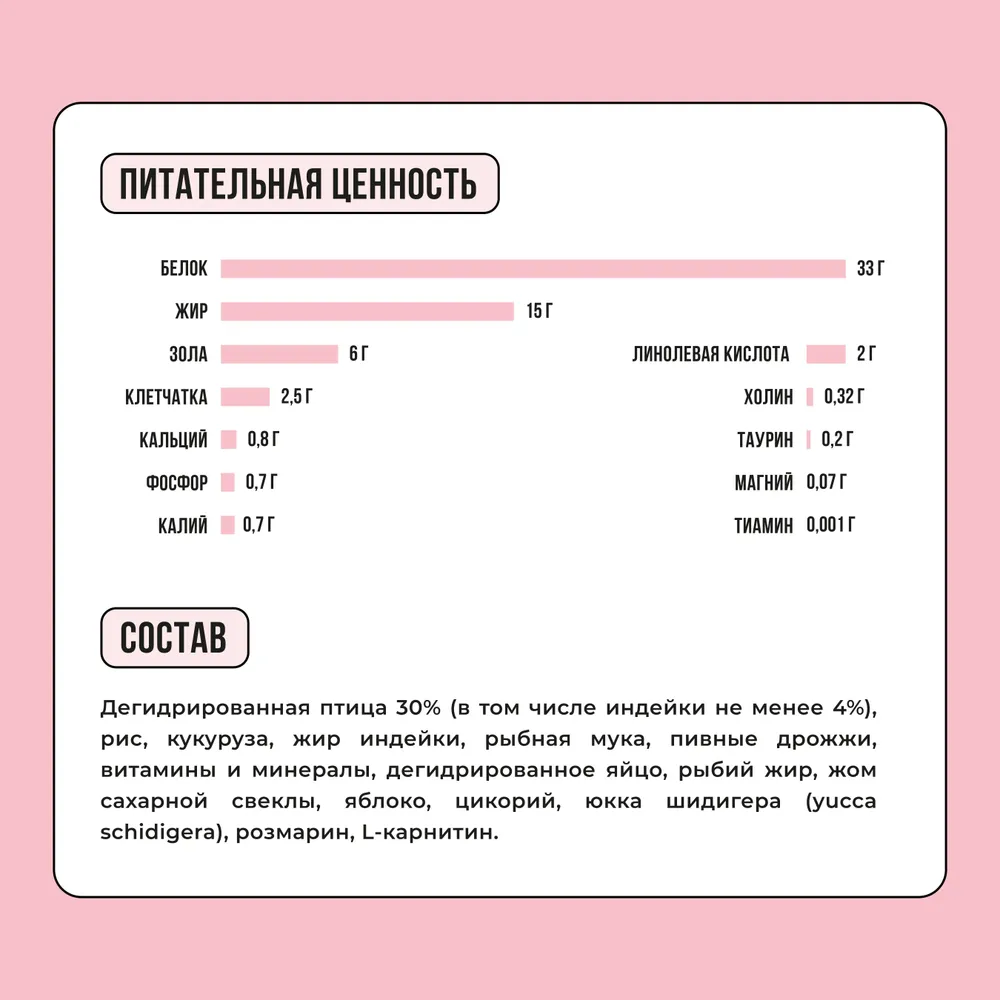 Дегидрированная птица 30 % (в том числе индейки не менее 4 %), рис, кукуруза, жир индейки, рыбная мука, пивные дрожжи, витамины и минералы, дегидрированное яйцо, рыбий жир, жом сахарной свеклы, яблоко, цикорий, юкка шидигера (yucca schidigera), розмарин, L-карнитин.