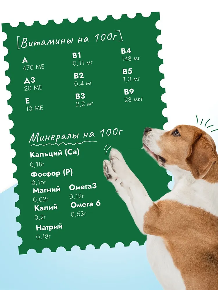 Аналитический состав: сырой протеин - 8,5 г, сырой жир - 4 г, сырая зола - 1,3 г, сырая клетчатка - 0,9 г, влага - 81 %, кальций - 0,18 г, фосфор - 0,16 г, магний - 0,02 г, калий - 0,2 г, натрий - 0,18 г, омега 3 жирные кислоты - 0,12 г, омега 6 жирные кислоты - 0,53 г.