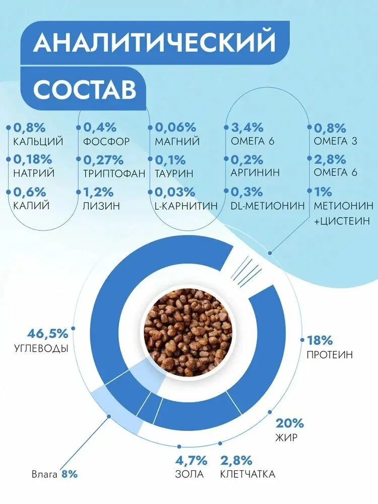Аналитический состав: Сырой протеин 18%, сырой жир 20%, углеводы 46,5%, сырая клетчатка 2,8%, сырая зола 4,7%, кальций 0,8%, фосфор 0,4%, натрий 0,18%, магний 0,06%, калий 0,6%, таурин 0,1%, лизин 1,2%, триптофан 0,27%, метионин + цистин 1%, L-карнитин 0,03%, DL-метионин 0,3%, аргинин 0,2%, омега 3 жирные кислоты 0,8%, омега 6 жирные кислоты 3,4%, влага 8%.