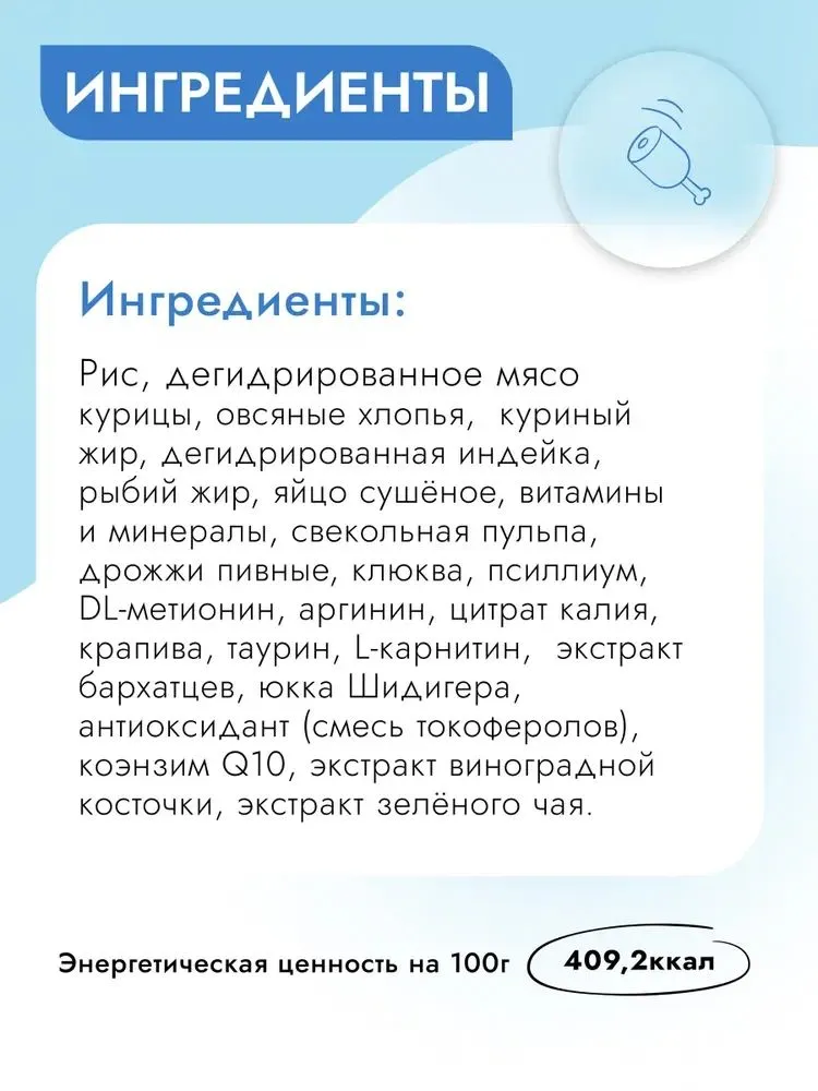 Состав: рис, дегидрированное мясо курицы, овсяные хлопья, куриный жир, дегидрированная индейка, рыбий жир, яйцо сушёное, витамины и минералы, свекольная пульпа, дрожжи пивные, клюква, псиллиум, DL-метионин, аргинин, цитрат калия, крапива, таурин, L-карнитин, экстракт бархатцев, юкка Шидигера, антиоксидант (смесь токоферолов), коэнзим Q10, экстракт виноградной косточки, экстракт зелёного чая.