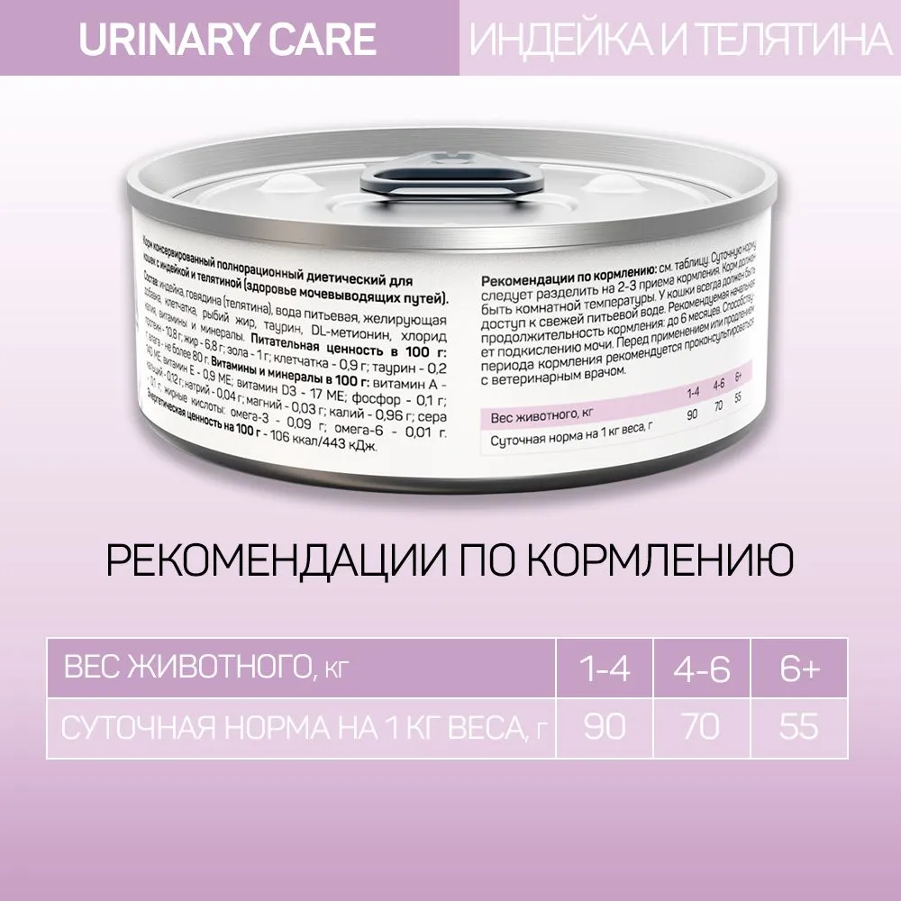 Рекомендации по кормлению: см. таблицу. Суточную норму следует разделить на 2-3 приема кормления. Корм должен быть комнатной температуры. У кошки всегда должен быть доступ к свежей питьевой воде. Рекомендуемая начальная продолжительность кормления: до 6 месяцев. Способствует подкислению мочи. Перед применением или продлением периода кормления рекомендуется проконсультироваться с ветеринарным врачом. Вес животного, кг 1-4 4-6 6+ Суточная норма на 1 кг веса, г 90 70 55