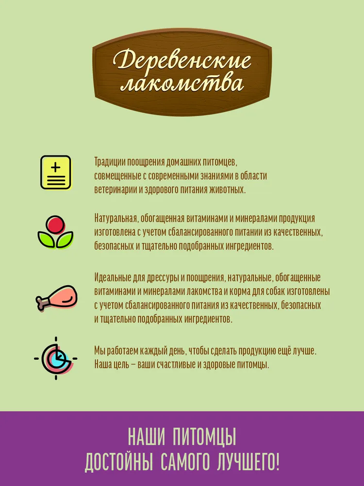 В основе «Деревенских лакомств» лежат традиции поощрения домашних питомцев, совмещенные с современными знаниями в области ветеринарии и здорового питания животных.