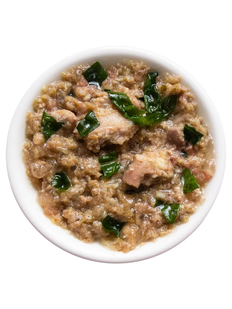 Состав: кролик, сердечки куриные, субпродукты мясные, шпинат, растительное масло, желирующая добавка, соль, вода. Пищевая ценность, %: белки — 8, жиры — 9, клетчатка — 1, зола — 2, влажность — 82.