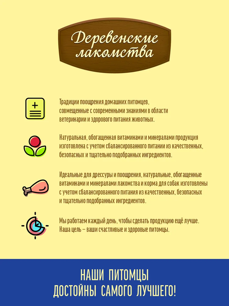В основе «Деревенских лакомств» лежат традиции кормления и поощрения домашних питомцев, совмещенные с современными знаниями в области ветеринарии и здорового питания животных.