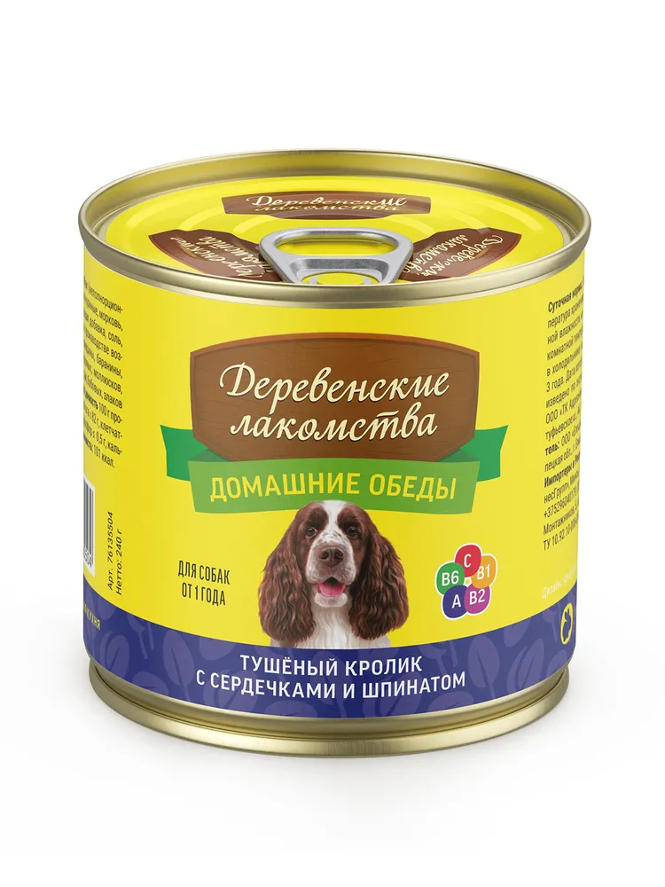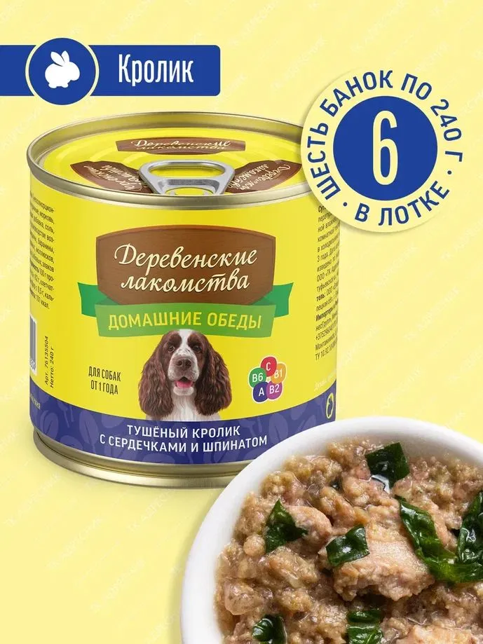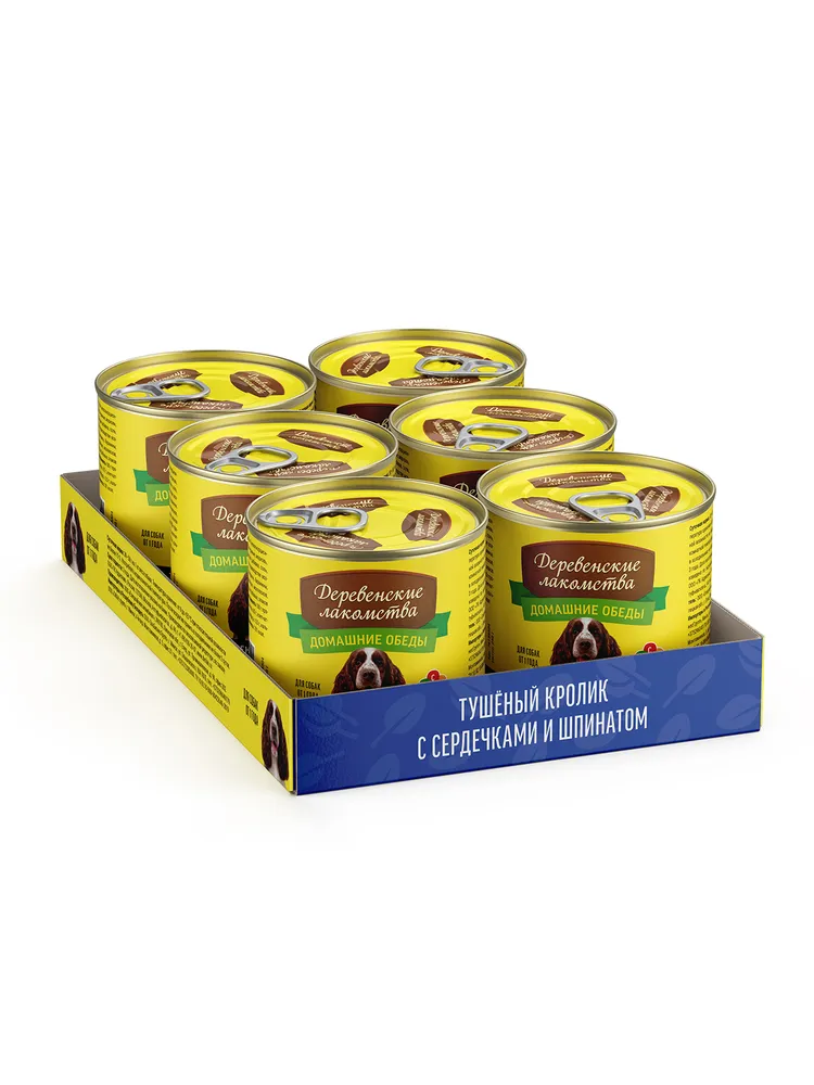Влажный корм для собак "Деревенские лакомства - Домашние обеды" Тушеный кролик с сердечками и шпинатом - наверное, самое вкусное и полезное блюдо в нашем меню. Диетическое мясо кролика, обожаемые собаками куриные сердечки и богатый витаминами и минералами шпинат.
