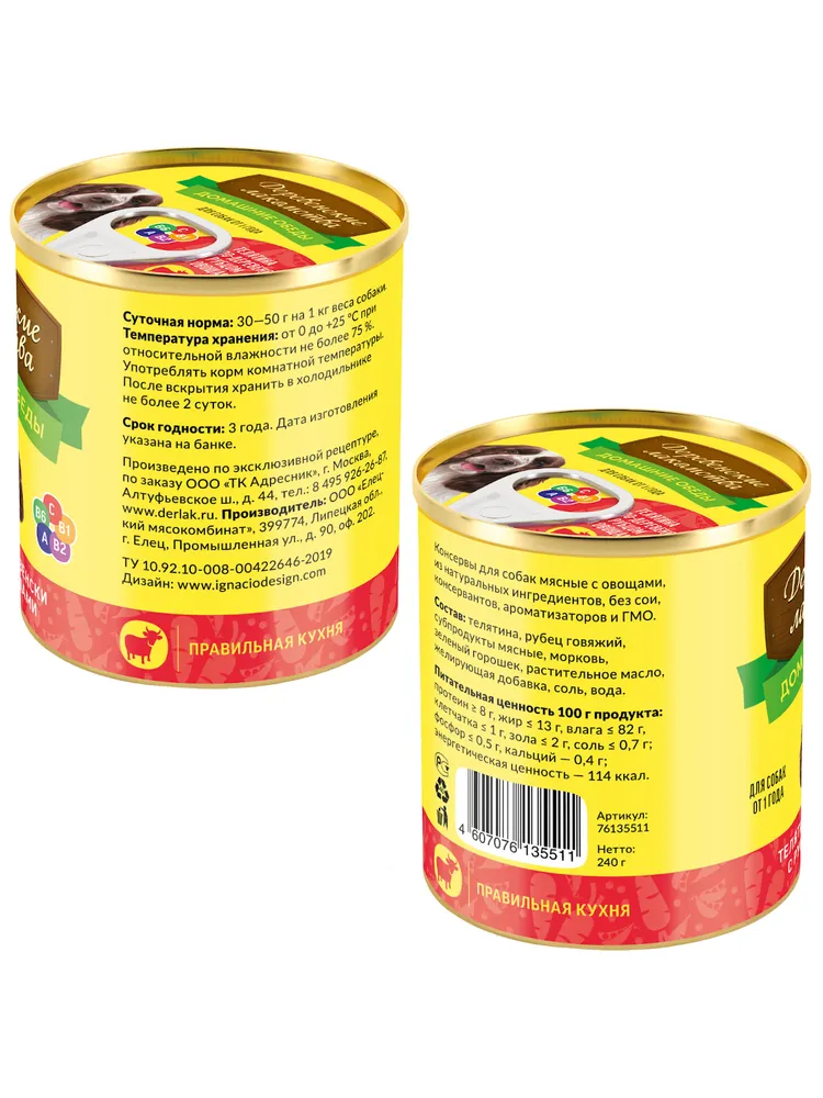 Влажный корм для собак "Деревенские лакомства - Домашние обеды" Телятина по-деревенски с рубцом и овощами - фирменное блюдо нашего шеф-повара. Насыщенный вкус томлёной телятины, дополненный любимым собаками рубцом. Витаминный рацион обеспечивают зеленый горошек и молодая морковь.