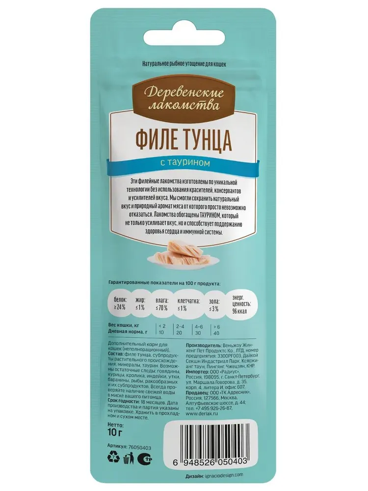 Деревенские лакомства филе тунца нежное д/кошек, 10г (76050403) |