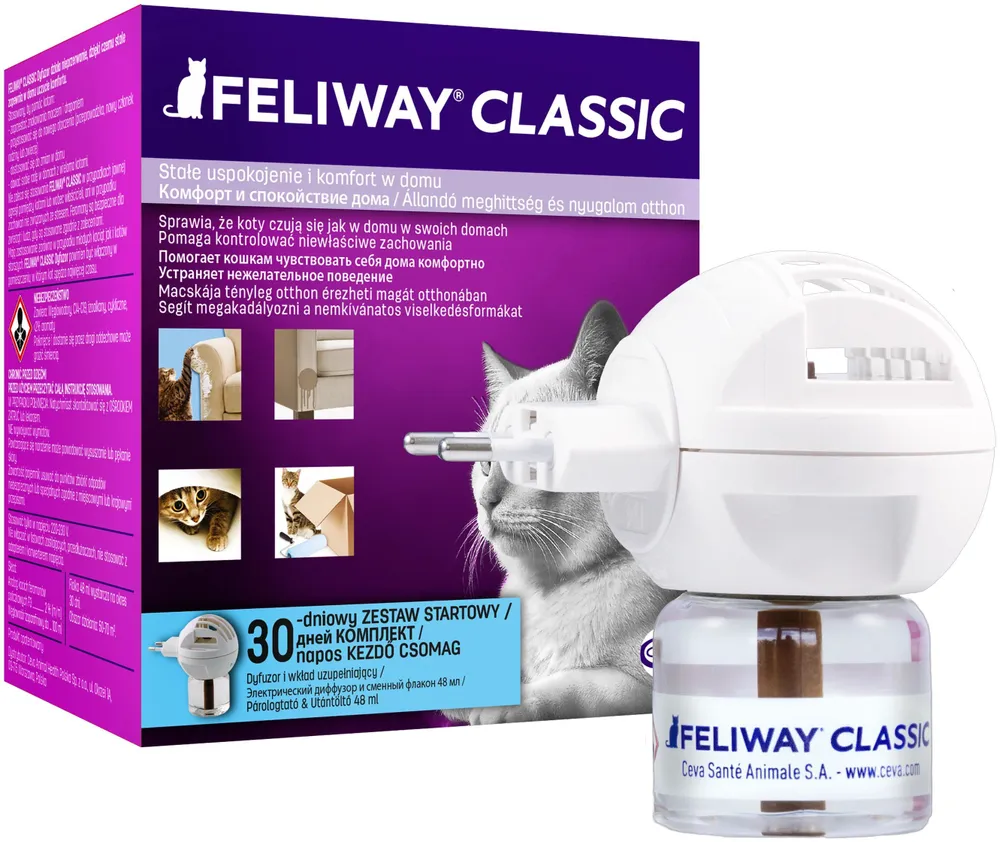 Feliway - синтетический аналог феромона лицевых желез кошки, который информирует кошку об отсутствии причин для беспокойства и создает у животного ощущение спокойствия и безопасности. Препарат выполнен в виде диффузора (флакона с кошачьим феромоном, включаемого в розетку, аналогично Раптору). Это эффективный и безопасный способ восстановить хорошее самочувствие и нормализовать поведение кошки в стрессовой ситуации.