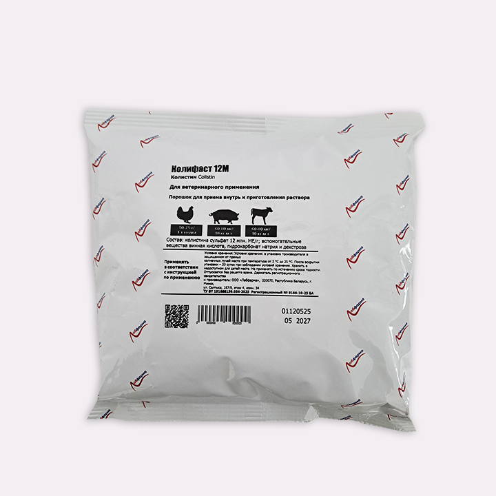 Колифаст 12М — высокоэффективный ветеринарный препарат нового поколения на основе колистина, разработанный для быстрой и надёжной терапии желудочно-кишечных инфекций у телят, свиней и птицы. Активен против широкого спектра патогенных бактерий, включая E. coli, Salmonella spp., Pasteurella spp. и другие.