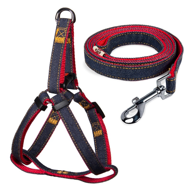 Комплект (Triol) поводок + шлейка, джинсовый, красный; 20мм*120см, 20мм*45-60см