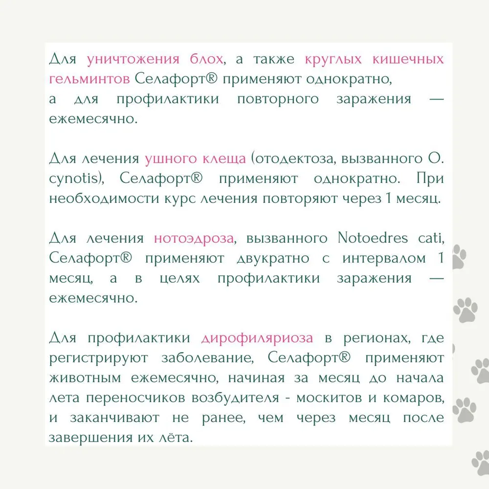 Описание1. Торговое наименование лекарственного препарата: Селафорт (Selafort). Международное непатентованное наименование: селамектин. 2. Лекарственная форма: раствор для наружного применения. Селафорт в форме 6% и 12% раствора в качестве действующего вещества содержит селамектин соответственно 60 мг/мл и 120 мг/мл и вспомогательные вещества: изопропиловый спирт, бутилгидрокситолуол, диметилсульфоксид. 3. По внешнему виду препарат представляет собой прозрачный раствор от бесцветного до желтого цвета, или от бесцветного до коричневого, или от бесцветного до коричнево-желтого, или от бесцветного до желто-зеленого цвета. Срок годности лекарственного препарата при соблюдении условий хранения - 2 года с даты производства. Запрещается применять препарат по истечении срока годности. 4. Селафорт выпускают расфасованным в полимерные пипетки разного объема с колпачками различного цвета - Селафорт 6% раствор по: 0,25 мл (розовый колпачок), 0,75 мл (бирюзовый колпачок), 1 мл (серо-коричневый колпачок); Селафорт 12% раствор по: 0,25 мл (фиолетовый колпачок), 0,5 мл (оранжевый колпачок), 1 мл (красный колпачок), 2 мл (зеленый колпачок), 3,0 мл (темно-синий колпачок). Пипетки упаковывают по 1 штук в блистер, который помещаeт вместе с инструкцией по применению в картонные коробки. Цвет коробки и колпачков пипеток в этой коробке одинаковы. 5. Препарат хранят в закрытой упаковке производителя, в защищенном от прямых солнечных лучей месте, отдельно от продуктов питания и кормов, вдали от нагревательных приборов и открытого огня при температуре от 0°С до 25°С. Хранить пипетки в оригинальной упаковке до использования. 6. Селафорт следует хранить в местах, недоступных для детей. 7. Неиспользованный лекарственный препарат утилизируют в соответствии с требованиями законодательства. 8. Отпускается без рецепта ветеринарного врача. 9. Селафорт относится к противопаразитарным лекарственным препаратам группы макроциклических лактонов. 10. Действующее вещество препарата - селамектин обладает широким спектром системного нематодоцидного, инсектицидного и акарицидного действия, активен против нематод, насекомых и саркоптоидных клещей, паразитирующих у собак и кошек, обладая ларвицидными и овоцидными свойствами, прерывает цикл развития насекомых. Фармакокинетические свойства препарата обеспечивают хорошее всасывание селамектина с места нанесения, длительное поддержание терапевтических концентраций в органах и тканях животного, что обеспечивает уничтожение паразитов и защиту животных от реинвазии в течение месяца. Механизм действия селамектина заключается в его способности связываться с рецепторами клеток (мышечной и нервной ткани) паразитов, повышать проницаемость мембран для ионов хлора, что вызывает блокаду проводимости нервных и мышечных клеток у нематод, насекомых, клещей и приводит к параличу и гибели паразитов. Учитывая, что у млекопитающих рецепторы, чувствительные к селамектину, локализованы только в центральной нервной системе, а селамектин не проникает через гематоэнцефалический барьер, отравление собак и кошек маловероятно. Селафорт по степени воздействия на организм относится к умеренно опасным веществам (3 класс опасности по ГОСТ 12.1.007-76), в рекомендуемых дозах не обладает местно-раздражающим, резорбтивно-токсическим и сенсибилизирующим действием, хор