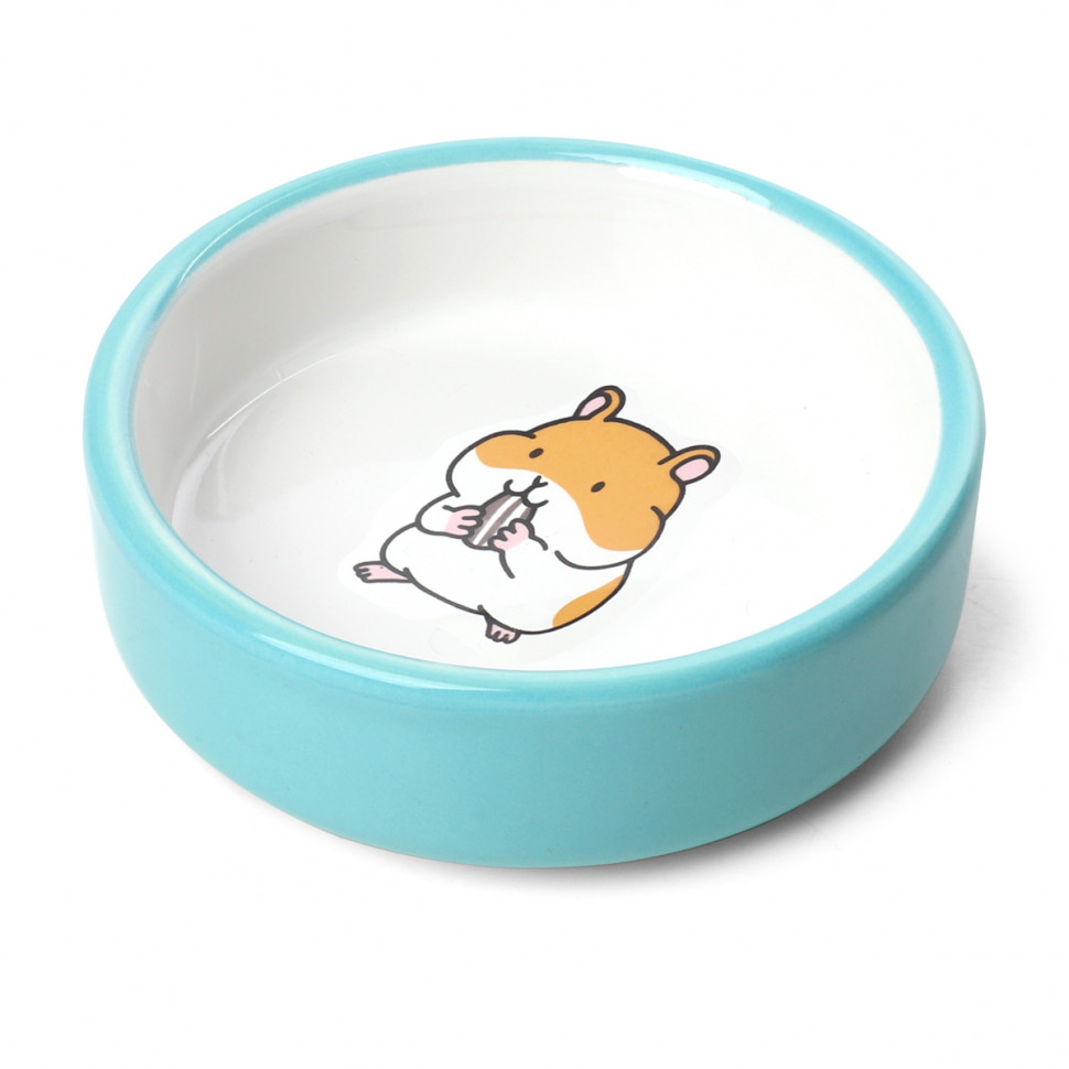 Стильная и функциональная миска для мелких животных выполнена из высококачественной керамики яркой расцветки. Такая миска идеально подойдет как для воды, так и для корма любой консистенции. Она комфортна для питомца и легко моется под струей проточной воды с использованием бытовых моющих средств. А оригинальный дизайн с изображением хомячка позволит ей стать украшением любого интерьера. Цвет изделия: бело-голубой. Размер изделия: d дна - 75мм; d верхней части - 85мм; высота - 25мм. Объём изделия: 0,1л.