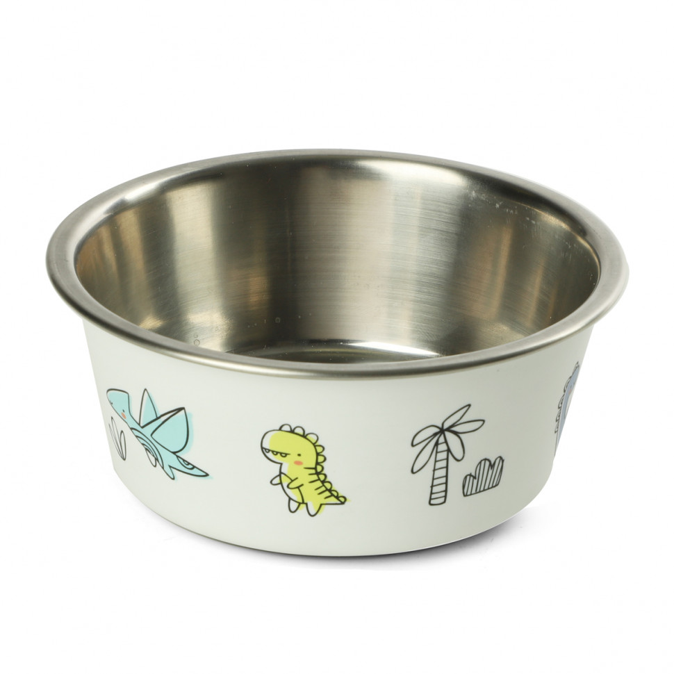Стильная круглая миска из нержавеющей стали "Динозаврики" с высокими бортиками идеально подходит как для воды, так и для корма разной консистенции. Миска комфортна для питомцев и легко моется под струей проточной воды с использованием бытовых моющих средств. Прорезиненное основание в виде лапки обеспечивает максимальную устойчивость, препятствуя скольжению изделия во время использования, а оригинальный принт сделает такую миску украшением любого интерьера. Цвет изделия: белый с цветным принтом. Объем изделия: 0,7л. Размер изделия: d153*62мм (d дна - 120мм).