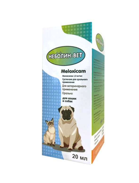 Неболин-вет это суспензия для орального применения (флаконы по 5,10 и 20 мл), предназначенная для собак и кошек в качестве препарата для лечения и профилактики болевого синдрома, в том числе послеоперационных болей, а также воспаления при острых и хронических заболеваниях опорно-двигательного аппарата.