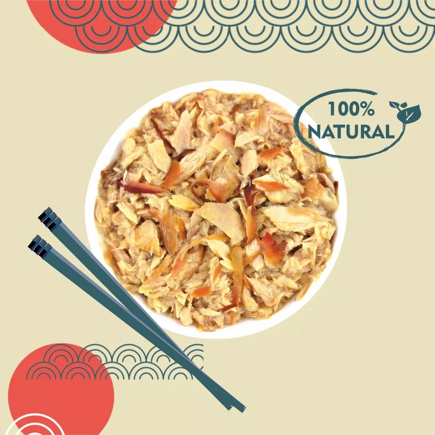 Ингредиентный состав: тунец Кацуо, куриный жир, кацуобуси, кальция фосфат, экстракт тунца Кацуо, загуститель, агар-агар, таурин, витамин Е, крахмал, экстракт зеленого чая.
