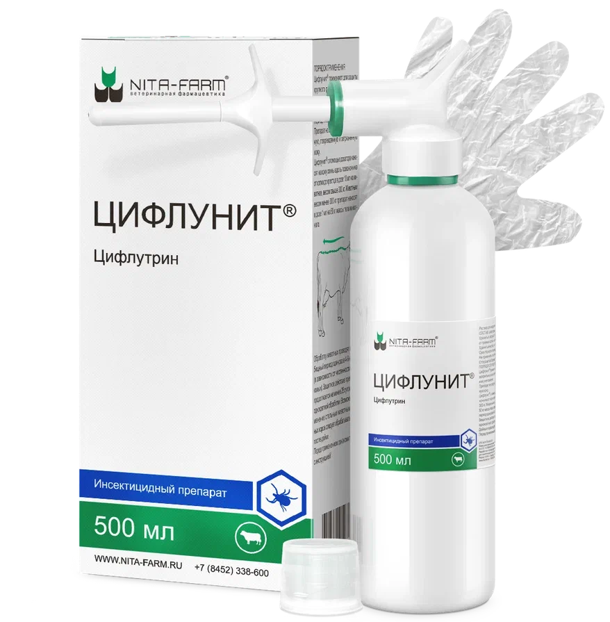 Цифлунит® в 1 мл в качестве действующего вещества содержит цифлутрин – 10 мг и вспомогательные вещества: cольвессо 200, 2-октилдодеканол и жидкий парафин.