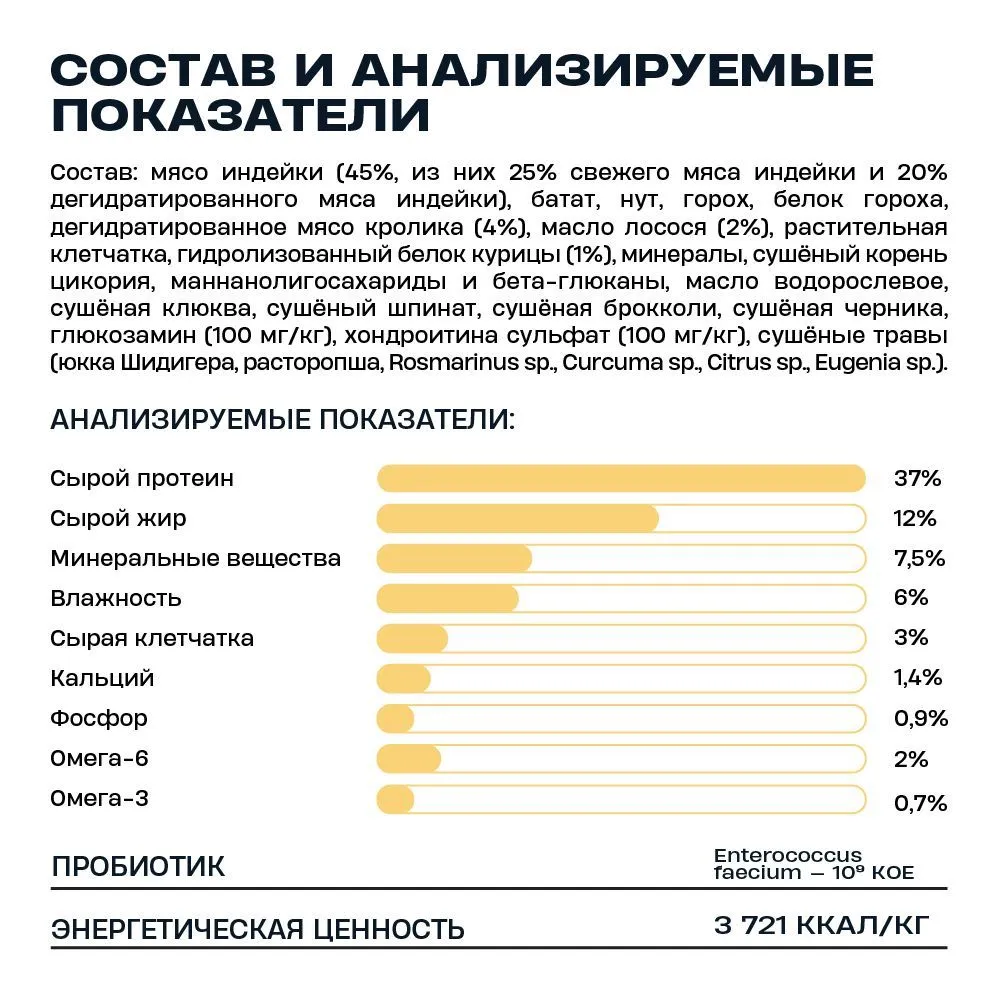 Мясо индейки (45%, из них 25% свежего мяса индейки и 20% дегидратированного мяса индейки), батат, нут, горох, белок гороха, дегидратированное мясо кролика (4%), масло лосося (2%), растительная клетчатка, гидролизованный белок курицы (1%), минералы, сушёный корень цикория, маннанолигосахариды и бета-глюканы, масло водорослевое, сушёная клюква, сушёный шпинат, сушёная морковь, сушёная черника, глюкозамин (100 мг/кг), хондроитина сульфат (100 мг/кг), сушёные травы (юкка Шидигера, расторопша, Rosmarinus sp., Curcuma sp., Citrus sp., Eugenia sp.).