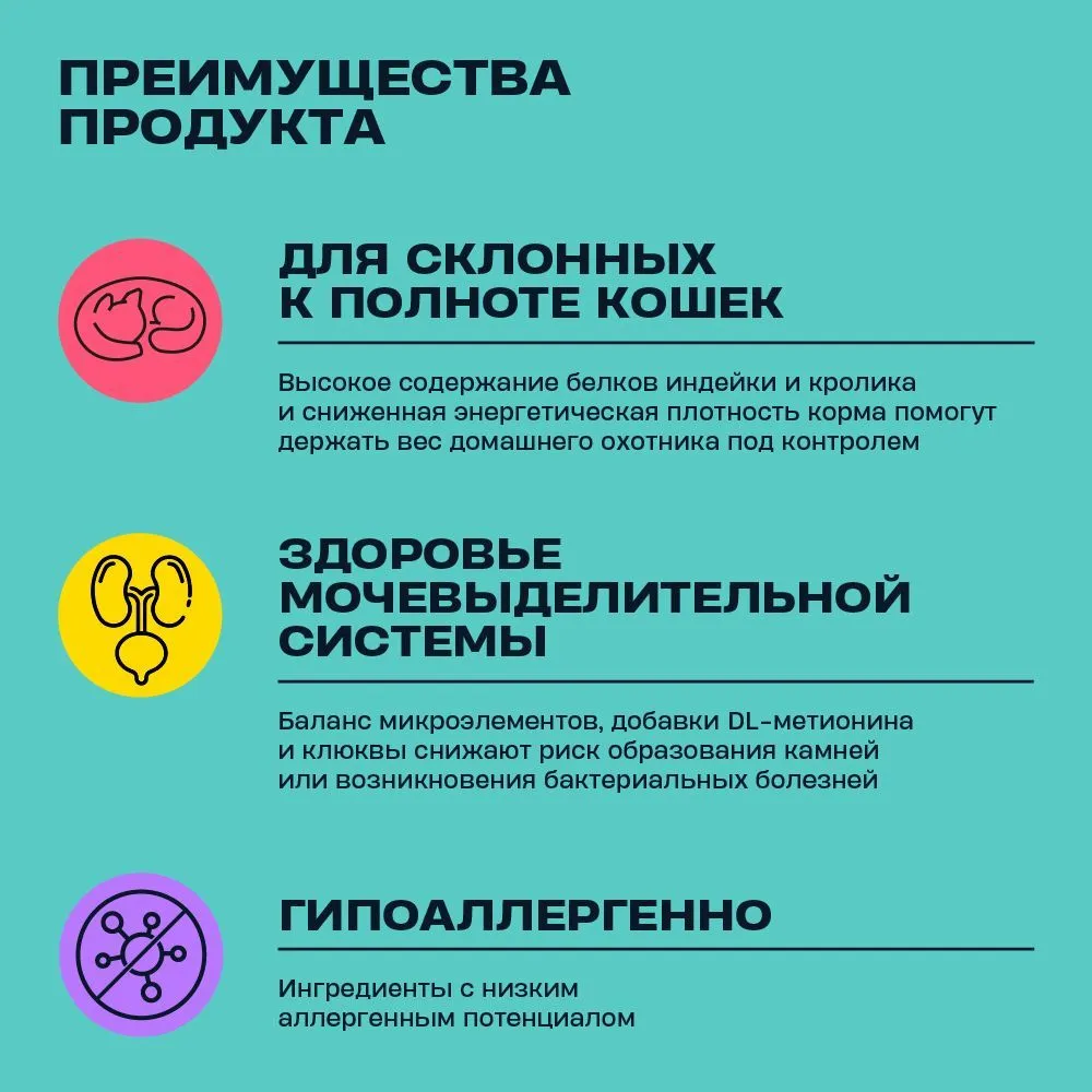 Wellement для стерилизованных кошек с индейкой и кроликом содержит высокое содержание протеина, при этом имеет низкий уровень углеводов и жиров, что позволяет кошке получить необходимую энергию, не набирая лишний вес. А если ваш котик или кошечка мало пьет, то вы можете комбинировать сухой корм Wellement для стерилизованных кошек с влажными кормами Wellement и профилактировать таким образом вероятные проблемы с кишечником или мочевыделительным трактом.