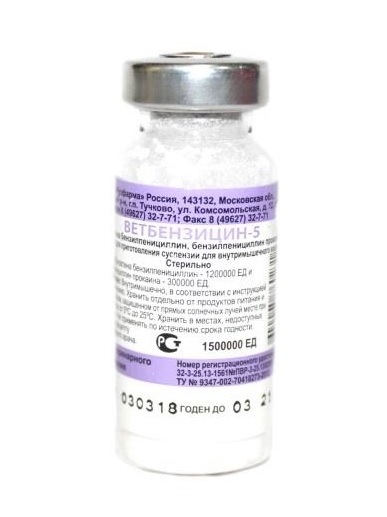 Ветбицин-5 — лекарственное антибактериальное средство пролонгированного действия в форме порошка для приготовления инъекционного раствора. 1 флакон Ветбицина-5 содержит в качестве действующих веществ смесь двух антибиотиков: бензатина бензилпенициллин — 1 200 000 ЕД и бензилпенициллина новокаиновую соль — 300 000 ЕД. Представляет собой порошок белого или белого с желтоватым оттенком цвета, с водой образует стойкую суспензию. Расфасовывают в герметично закрытые стеклянные флаконы вместимостью 10 мл или 20 мл, укупоренные резиновыми пробками и обкатанные алюминиевыми колпачками. УСЛОВИЯ ХРАНЕНИЯ С предосторожностью по списку Б. В сухом, защищенном от прямых солнечных лучей и недоступном для детей и животных месте при температуре от 0 до 25 °С. Срок годности — 3 года.