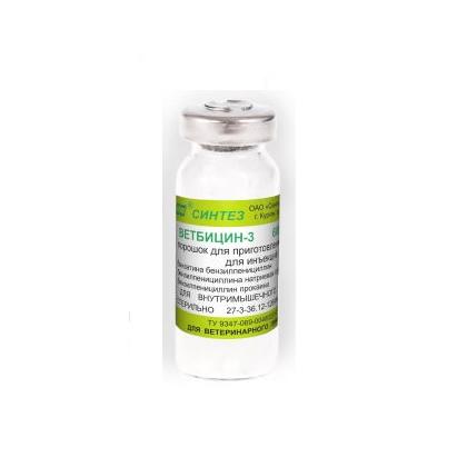 Ветбицин-3 – комплексный антибактериальный препарат, содержащий три биосинтетических пенициллина, обладает широким спектром антибактериального действия в отношении преимущественно грамположительных микроорганизмов, включая стрептококки, стафилококки, пневмококки, диплококки, спирохеты, сибиреязвенную палочку, коринебактерии; не действует на анаэробные бактерии, микобактерии, грибы, вирусы и риккетсии. Механизм бактерицидного действия пенициллинов основан на ингибировании ферментов транспептидазы и карбоксипептидазы, что приводит к нарушению связей между молекулами пептидогликана и разрушению бактериальной клетки. После внутримышечного введения компоненты Ветбицина-3 всасываются в кровь, медленно гидролизуются с высвобождением бензилпенициллина, достигая максимальной концентрации через 12-24 часа, и сохраняются в терапевтической концентрации на протяжении 3-4 суток. Пенициллины выводятся из организма главным образом почками и частично через кишечник. Ветбицин-3 для инъекций по степени воздействия на организм относится к высокоопасным веществам (2 класс опасности по ГОСТ 12.1.007).