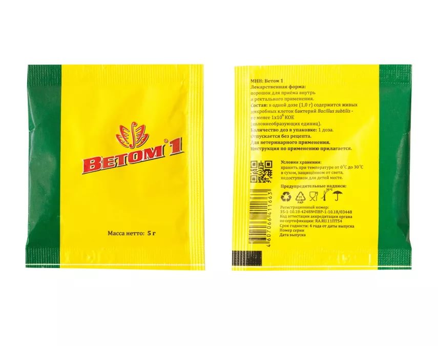 Порошок для приема внутрь и ректального применения. Ветом 1 содержит сухую бакмассу живых спорообразующих бактерии штамма Bacillus subtilis DSM 32424, а также вспомогательные вещества - сахарную пудру и крахмал. В 1 г препарата содержится: живых микробных клеток бактерий Bacillus subtilis - не менее 1x106 КОЕ (колониеобразующих единиц). По внешнему виду Ветом 1 представляет собой мелкодисперсный порошок белого цвета, без запаха, растворимый в воде, с образованием осадка белого цвета. Лекарственный препарат расфасован по 1,0 г (1 доза); 2,0 г (2 дозы); 5,0 г (5 доз); 10,0 г (10 доз); 50,0 г (50 доз); 100,0 г (100 доз); 300,0 г (300 доз) и 500,0 г (500 доз) в пакеты из ламинированной бумаги или полимерных водонепроницаемых материалов или в банки полимерные.