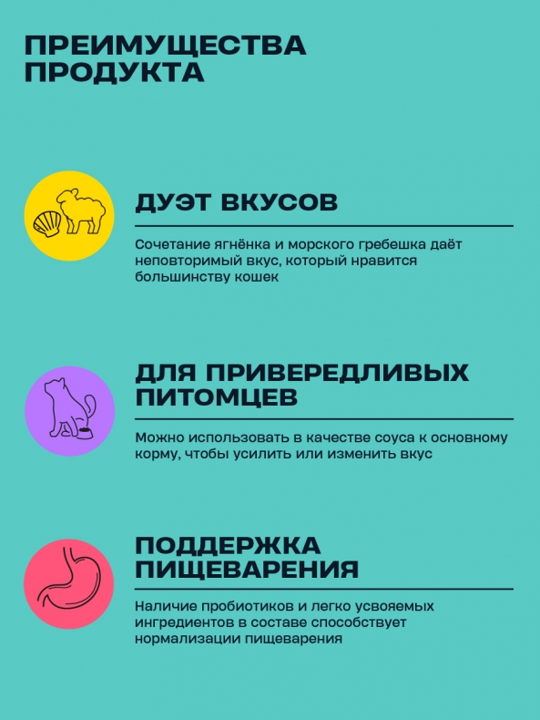 Дуэт вкусов ягнёнка и морского гребешка сочетает в себе насыщенность и мягкость. Ягнёнок — источник легкоусвояемого белка, идеально подходящего для чувствительных кошек, а морской гребешок добавляет утончённый морской аромат и делает вкус по-настоящему изысканным. Такое сочетание особенно нравится кошкам, которые ценят необычные и сбалансированные вкусы.
