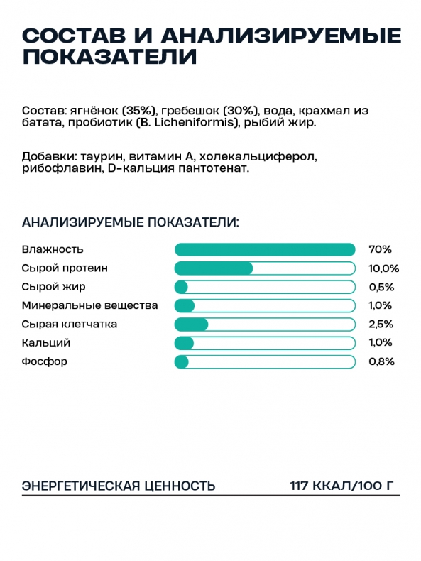 ягнёнок (35%), гребешок (30%), вода, крахмал из батата, пробиотик (B. Licheniformis), рыбий жир